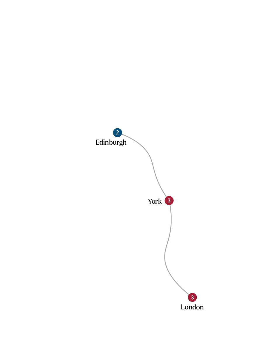 - First-Class rail travel between London, York, and Edinburgh