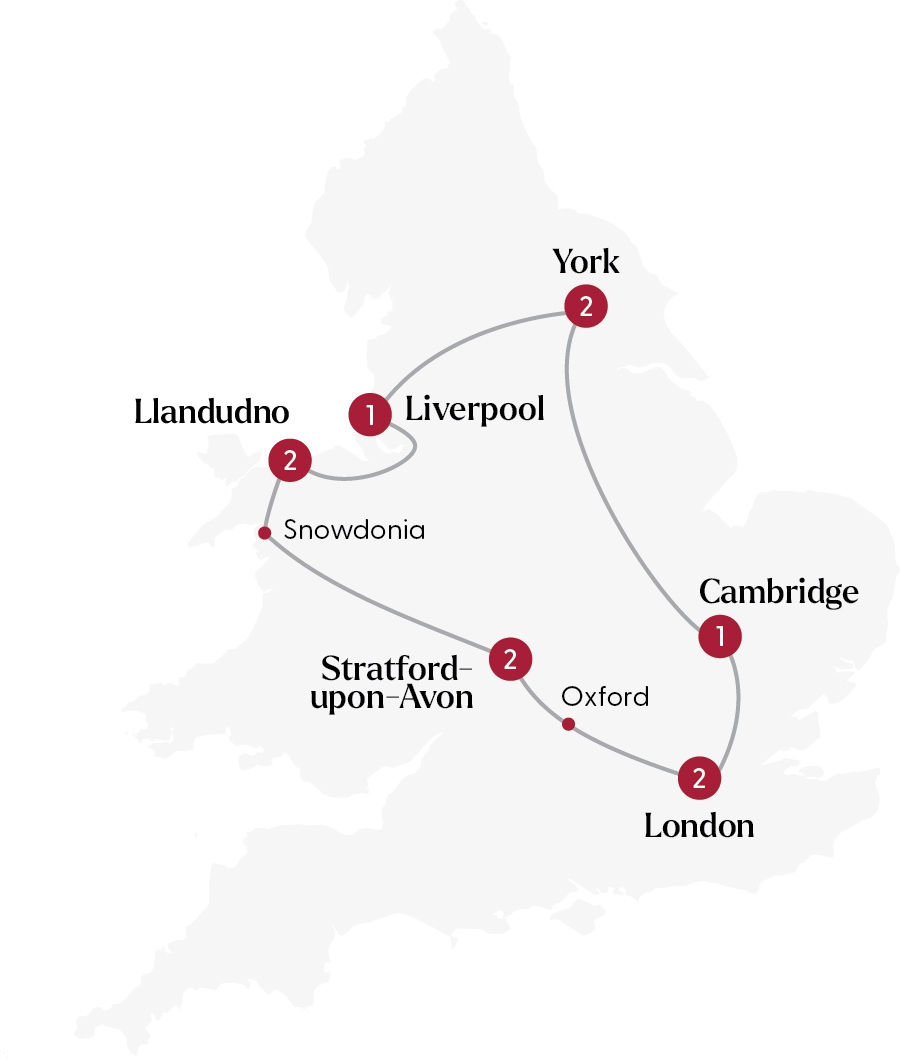 Step into a journey rich with history, charm, and culture as you explore some of Britain’s most captivating destinations. Enjoy a punt along the River Cam soaking in Cambridge’s academic elegance. Wander through York’s medieval streets and marvel at the grandeur of York Minster. Feel the rhythm of music history in Liverpool, birthplace of The Beatles, before crossing into the scenic landscapes of North Wales, where ancient castles stand guard over rugged coastlines. Relive the world of Shakespeare in Stratford-upon-Avon, admire the scholarly beauty of Oxford, and conclude in the vibrant heart of London, where centuries of heritage meet cutting-edge style. This is England and Wales at their storybook best.