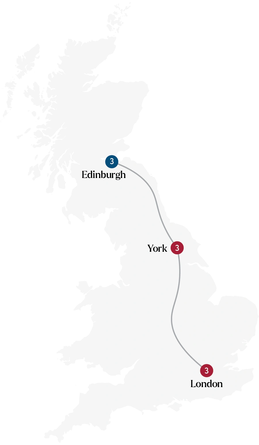 Travel in style on a grand adventure linking the historic capitals of London and Edinburgh with the timeless beauty of Britain’s countryside. Begin with the sophistication of London, where iconic landmarks and royal pageantry set the tone. Step inside Windsor Castle, the King’s official residence, before heading north aboard the sleek, first-class carriages of the LNER — an elegant ride through rolling landscapes to medieval York. Explore the cobbled streets of this walled city and admire the stately grandeur of Castle Howard. Continue into Scotland for a royal welcome in Edinburgh, rich with history and charm. A visit to Stirling Castle, a fortress of kings and legends, crowns your journey. With luxury travel, curated sightseeing, and hand-picked accommodations, this is Britain at its most refined.