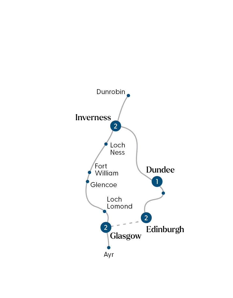 Experience the very best of Scotland on this unforgettable 8-day journey through stunning landscapes, historic landmarks, and vibrant cities. Begin in Glasgow with a guided city tour, then explore the charm of Burns Country and the dramatic beauty of Culzean Castle. Travel deep into the Highlands to discover iconic sights like Loch Ness, Glencoe, and the romantic ruins of Urquhart Castle—complete with a scenic cruise and tales of the legendary Nessie.
